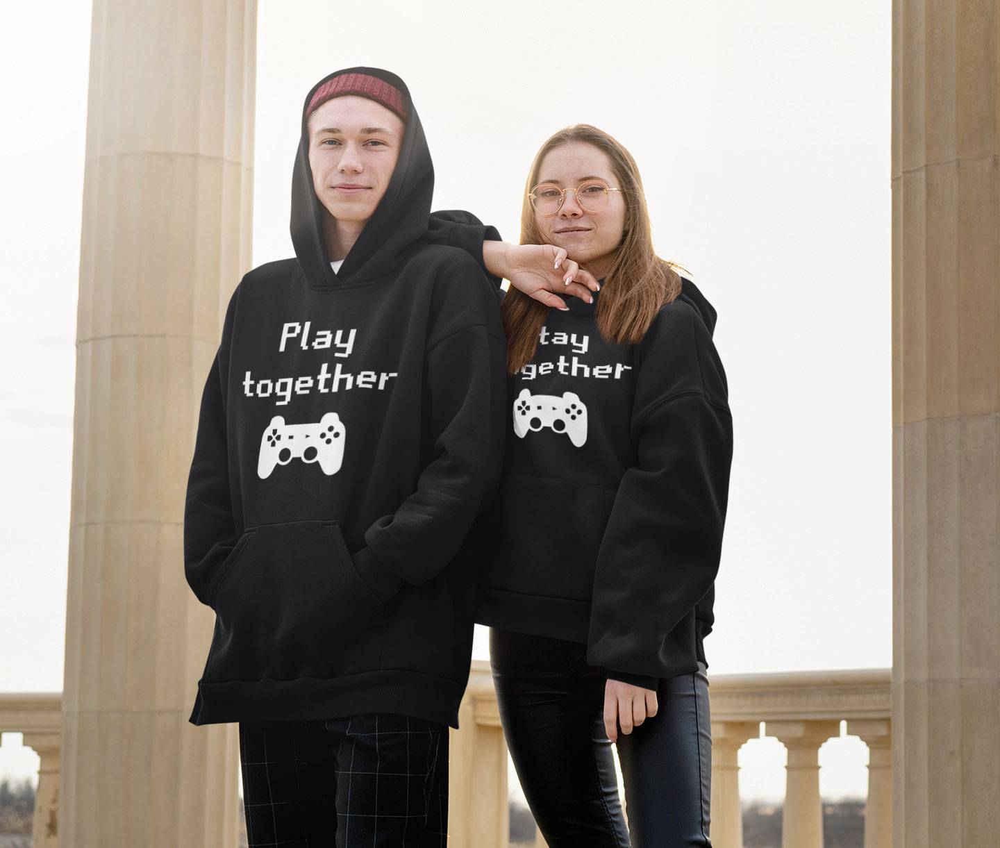 Komplet puloverjev z napisom za pare “Play together, stay together”. Pulover z napisom je odlično in uporabno darilo. Top darilo za valentinovo, obletnico.