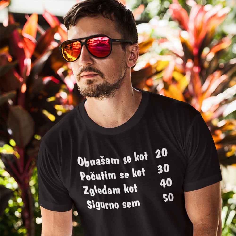 Šaljiva majica za 50 let. Obnašam se kot 20, počutim se kot 30, zgledam 40 , sigurno sem 50.