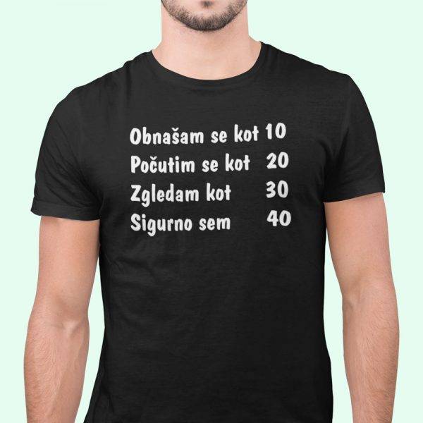 Majica z napisom je odlična kot šaljivo in uporabno darilo za 40 let. Top majica za praznovanje 40 rojstnega dne. Obnašam se kot 10, počutim se kot 20, zgledam 30, sigurno sem 40.
