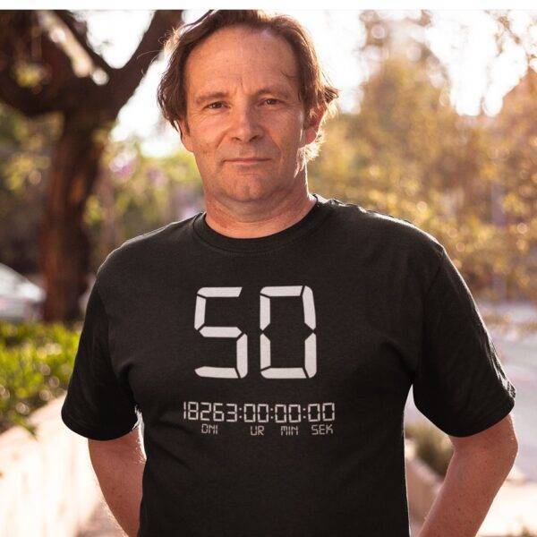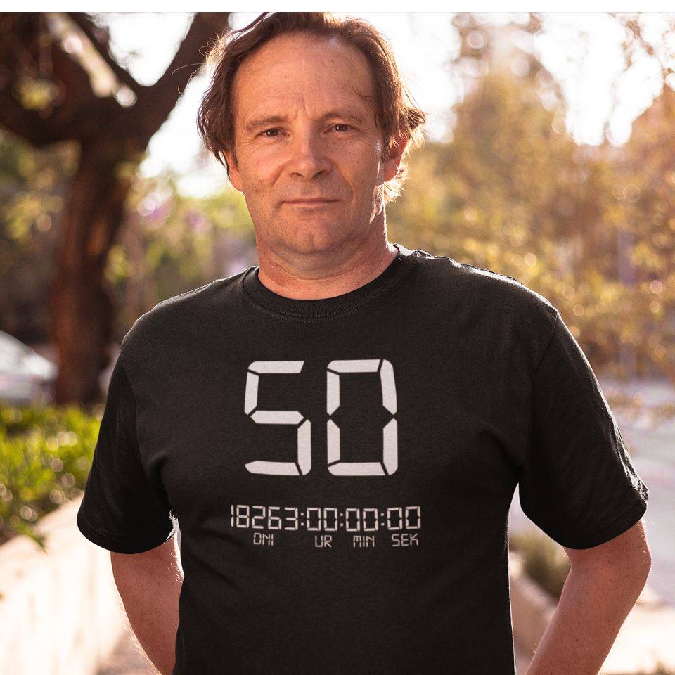 Smešna majica za rojstni dan – digitalna ura za 50. Majica s šaljivim motivom je odlično darilo za rojstni dan. Šaljiva majica s potiskom za abrahama.