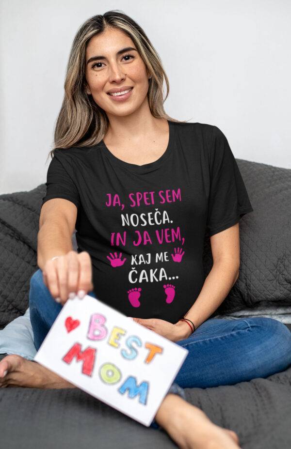 Majica za nosečnico z napisom spet sem noseča punčka. Majica je odlično darilo za nosečnico.