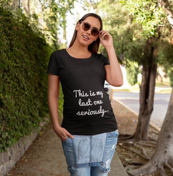 Majica za nosečnice z napisom “This is my last one seriously”. Majice je odlično darilo za nosečnico.
