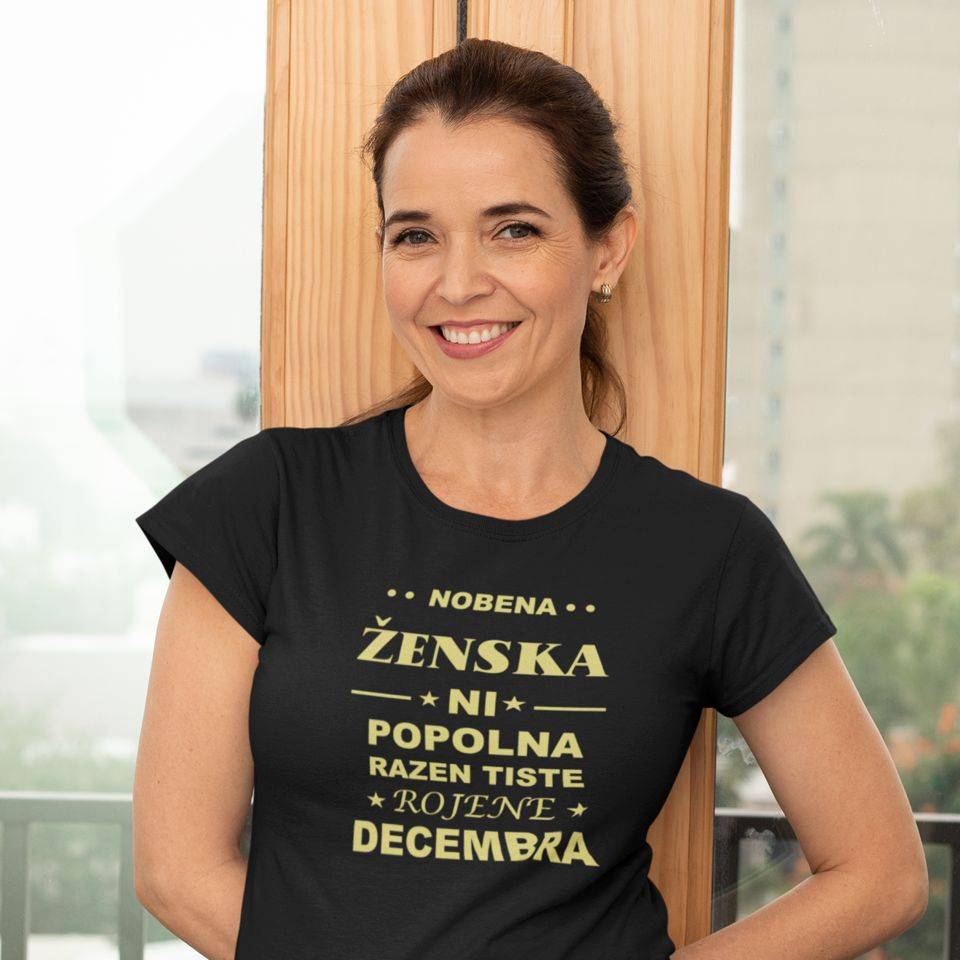 Smešna potiskana majica z napisom ” nobena ženska ni popolna razen tiste rojene decembra”. Majica je šaljivo in uporabno darilo. Top majica.