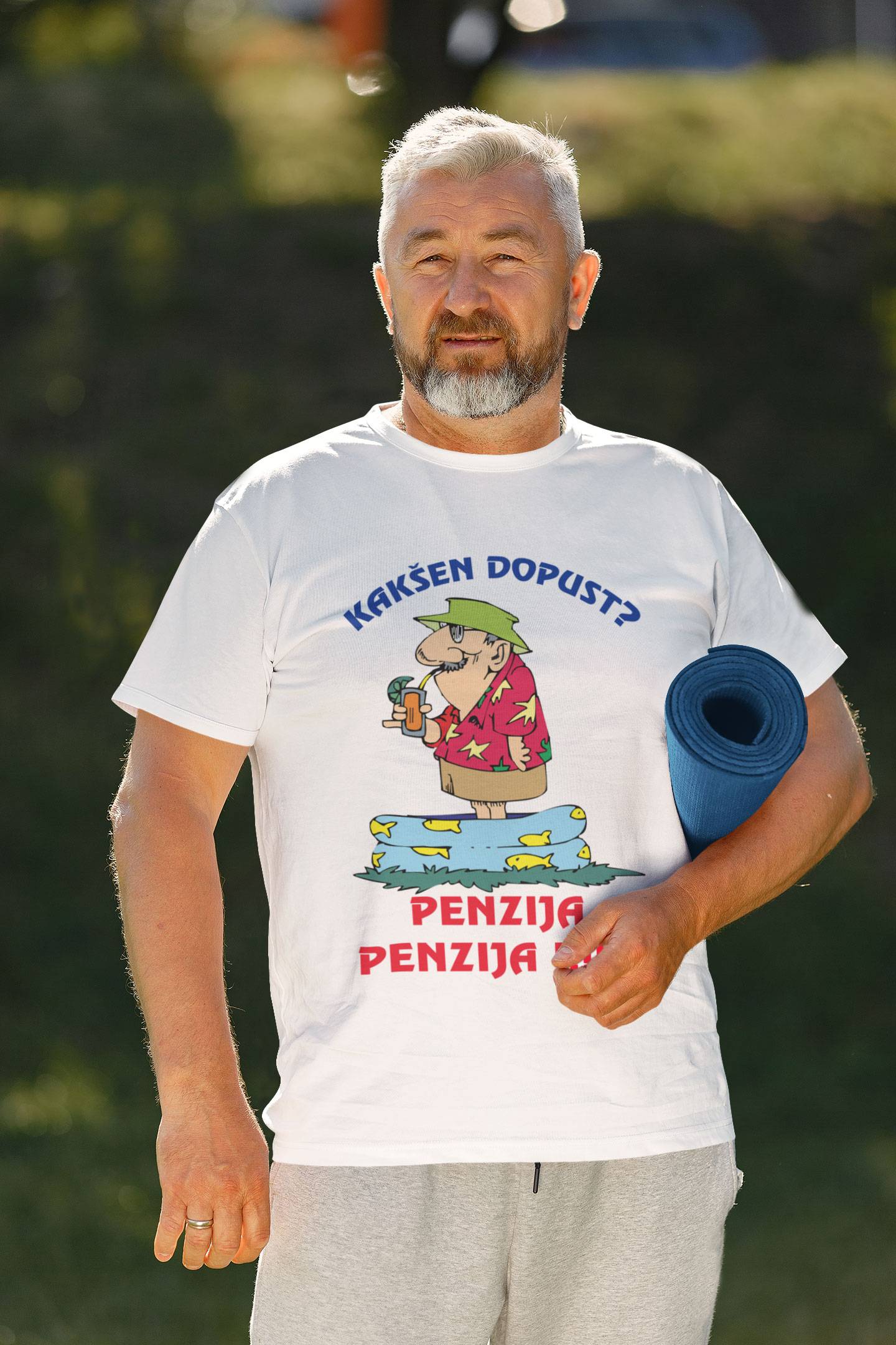 Smešna majica z upokojitev z napisom “kakšen dopust penzija”. Majice je odlično darilo ob upokojitvi.