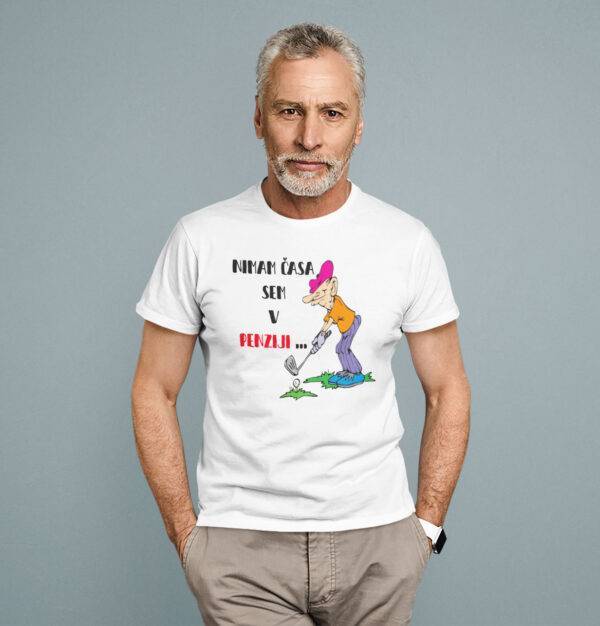 Smešna majica z upokojitev z napisom “nimam časa sem v penziji golf”. Majica je odlično darilo ob upokojitvi.
