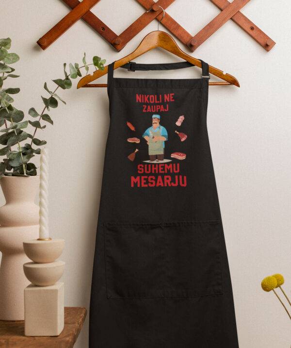 Predpasnik z napisom “Nikoli ne zaupaj suhemu mesarju” Predpasnik je odlično darilo za rojstni dan ali kar tako.