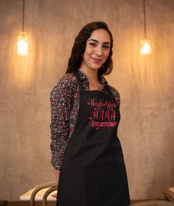 Predpasnik z napisom za mamo “najboljša mami na svetu”. Predpasnik je odlično darilo za rojstni dan ali kar tako.