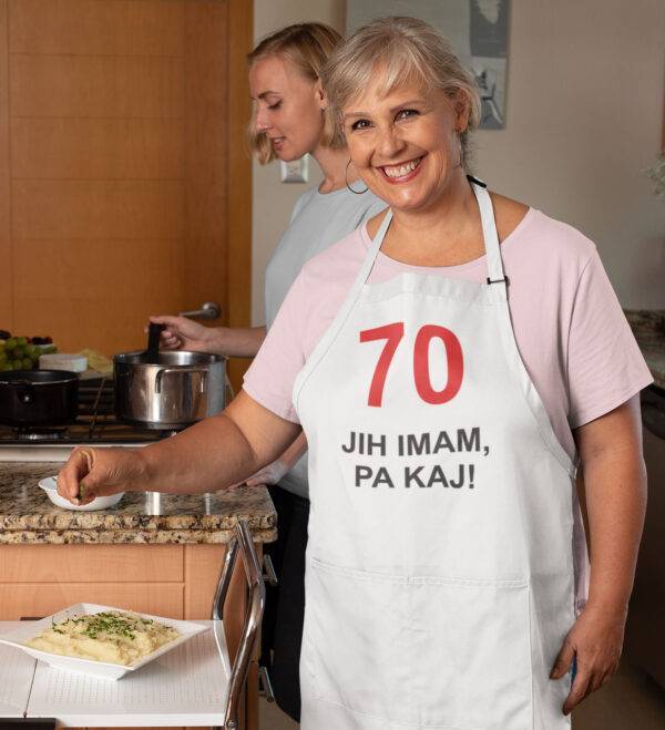 Predpasnik za rojstni dan z napisom “70 jih imam pa kaj”. Predpasnik je odlično darilo.