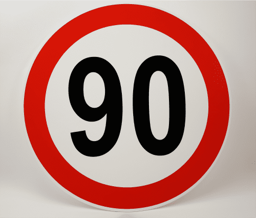 Prometni znak omejitev 90 je idealen za izdelavo dekoracije ob praznovanju osemnajstega rojstnega dne. Znak obesite na okno ali vrata, pritrdite na mlaj. Prometni znak je izdelan iz kakovostnega in neškodljivega PVC materiala, debeline 2 mm ali 3mm, dimenzije ⌀ 28cm ali ⌀48cm, obstojen vsaj 3 leta za notranjo in zunanjo uporabo.
