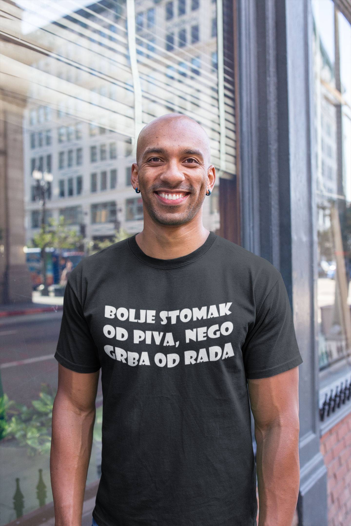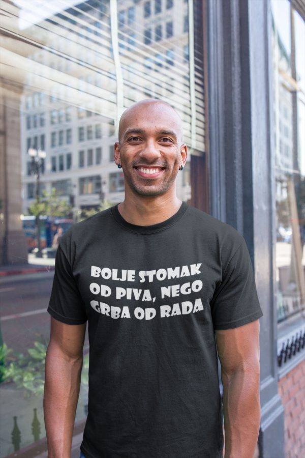 Smešna pivska majica “Bolje stomak od piva nego grba od rada”