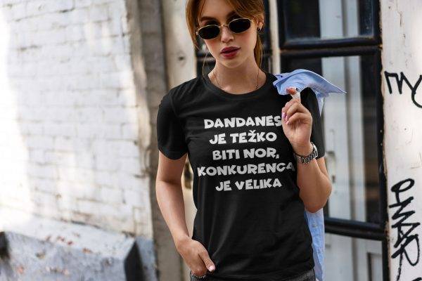 Smešna majica z napisom “Dandanes je težko biti nor, konkurenca je velika”.