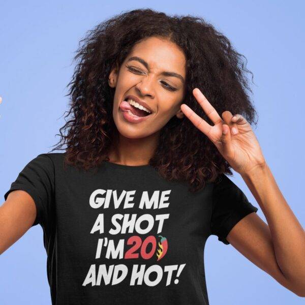 Top majica s šaljivim napisom ” Give me a Shot im 20 and Hot”. Smešna majica z napisom je odlično in uporabno darilo za rojstni dan.