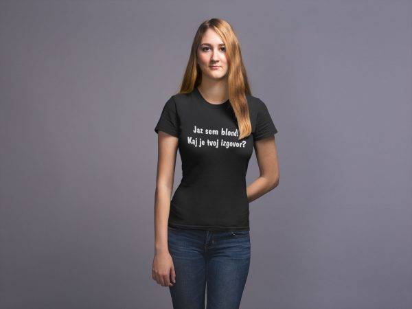 Majica s smešnim napisom “jaz sem blond kaj je tvoj izgovor”.