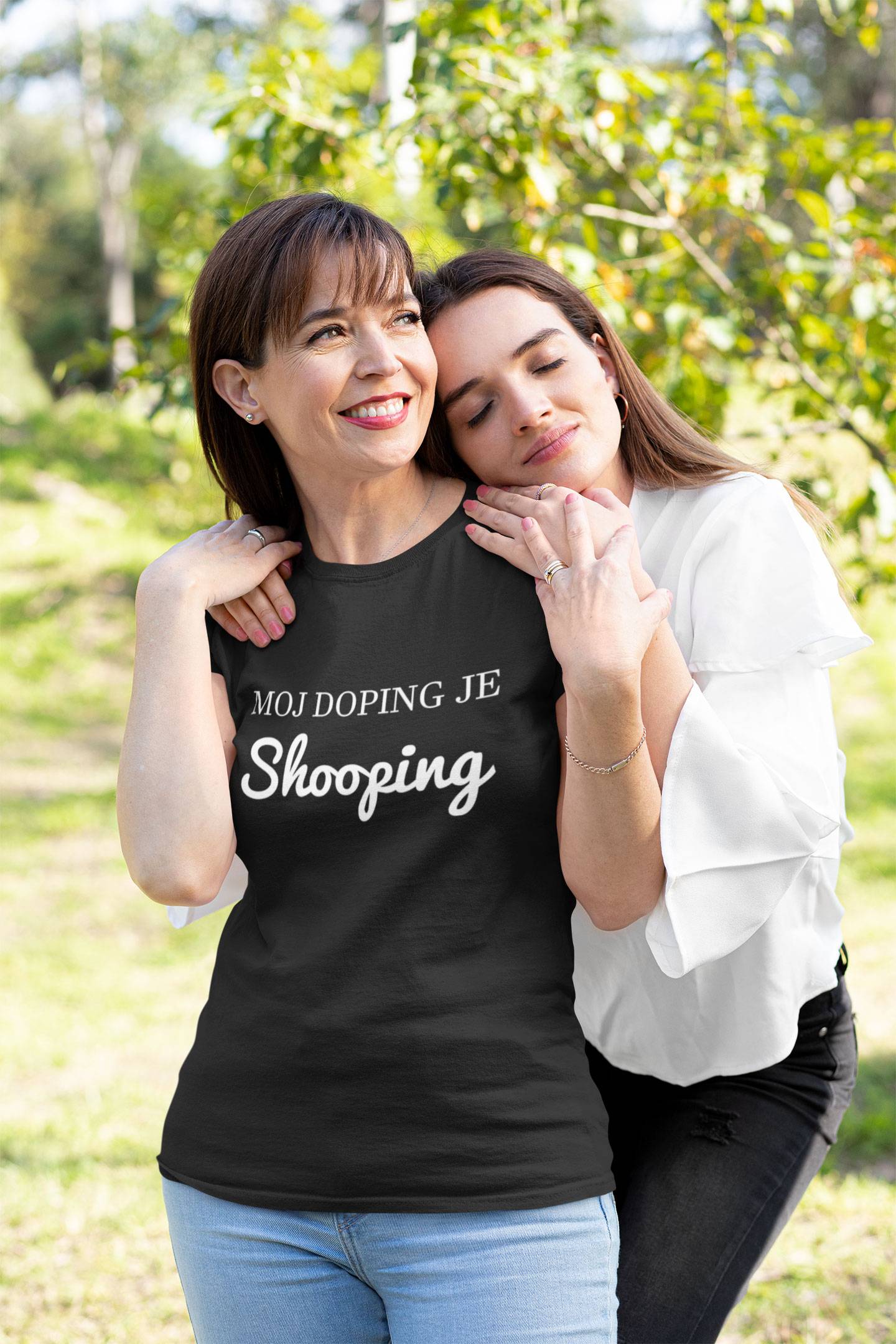 Smešna majica z napisom moj doping je shopping. Majica je odlično darilo za prijateljico, ki obožuje shopping.