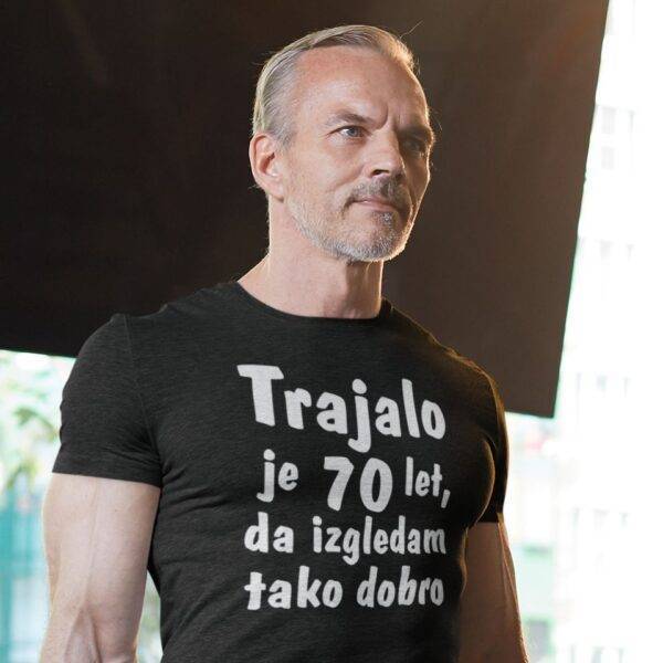 Smešna majica z napisom ” Trajalo je 70 let da izgledam tako dobro”. Majica s potiskom je uporabno in zanimivo darilo ob rojstnem dnevu.