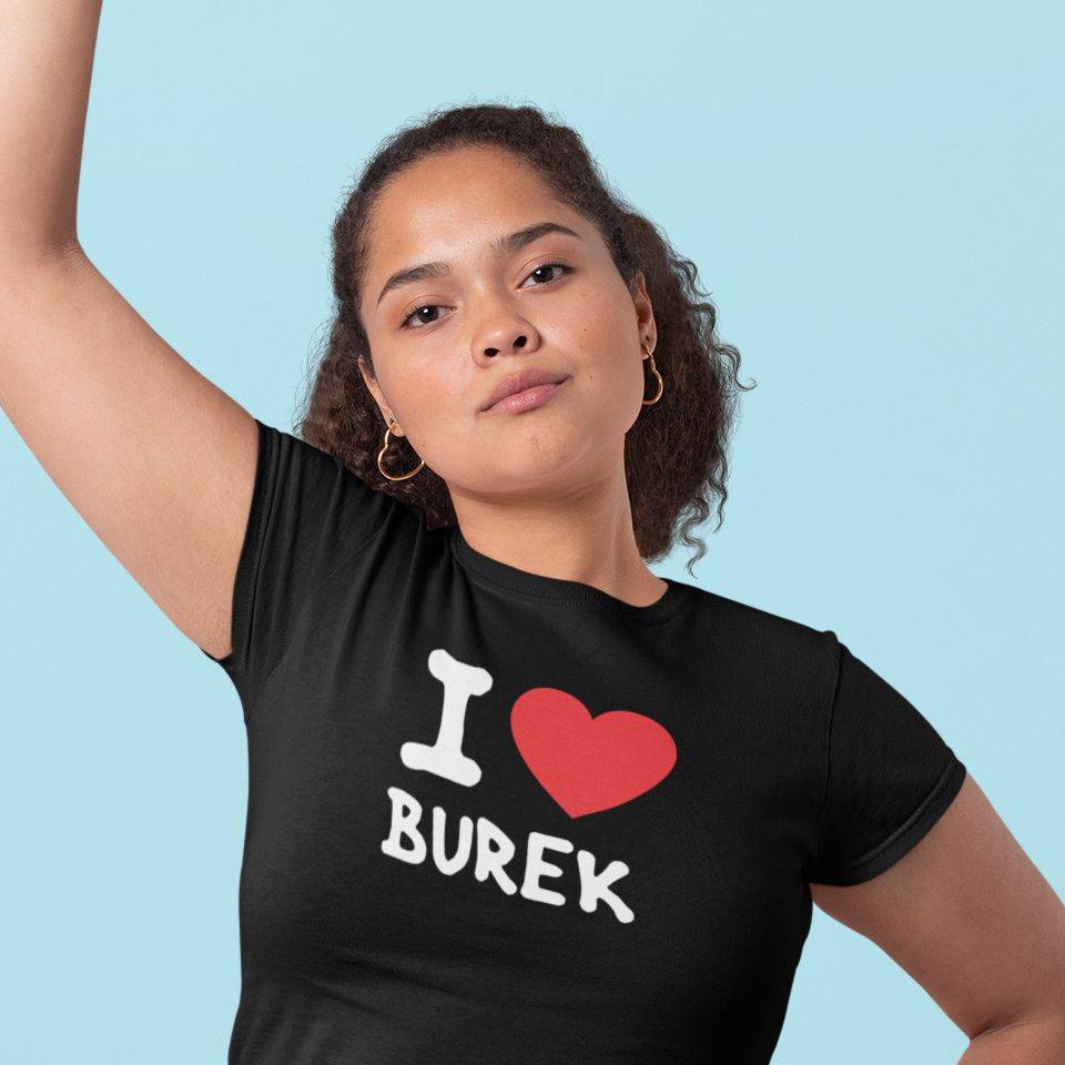 Majica s smešnim napisom “I Love burek”. Majica je odlično darilo in uporabno darilo ob različnih priložnostih. Top majica . Majica za na burek.