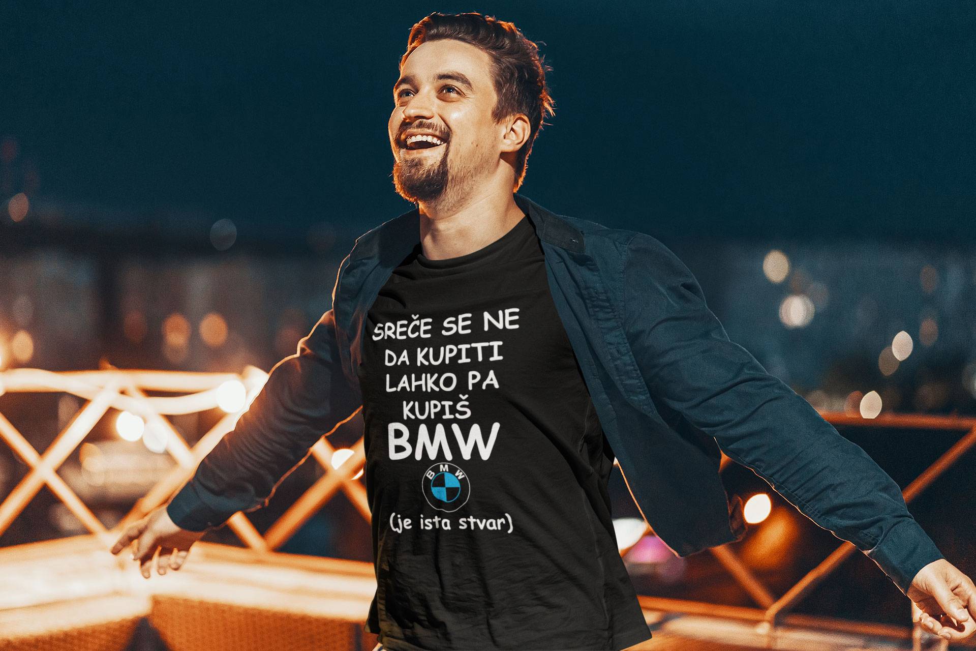 Smešna majica z napisom “sreče se ne da kupiti lahko si pa kupiš bmw je ista stvar”