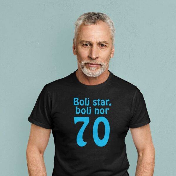 Smešna majica z napisom za sedemdeseti rojstni dan boj star bolj nor 70. Majica je odlična kot šaljivo in uporabno darilo za 70 let.