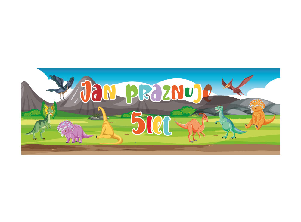 Transparent za rojstni dan dinozavri s imenom in starostjo po želji. Dimenizija trasparenta je 0,5×1,5m